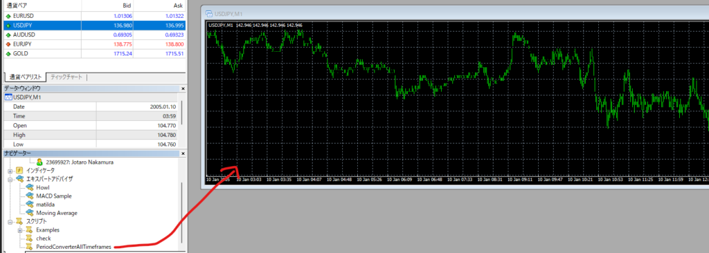 1分足のチャートを開き,そこにScripts/PeriodConverterAllTimeframesをドラッグアンドドロップ